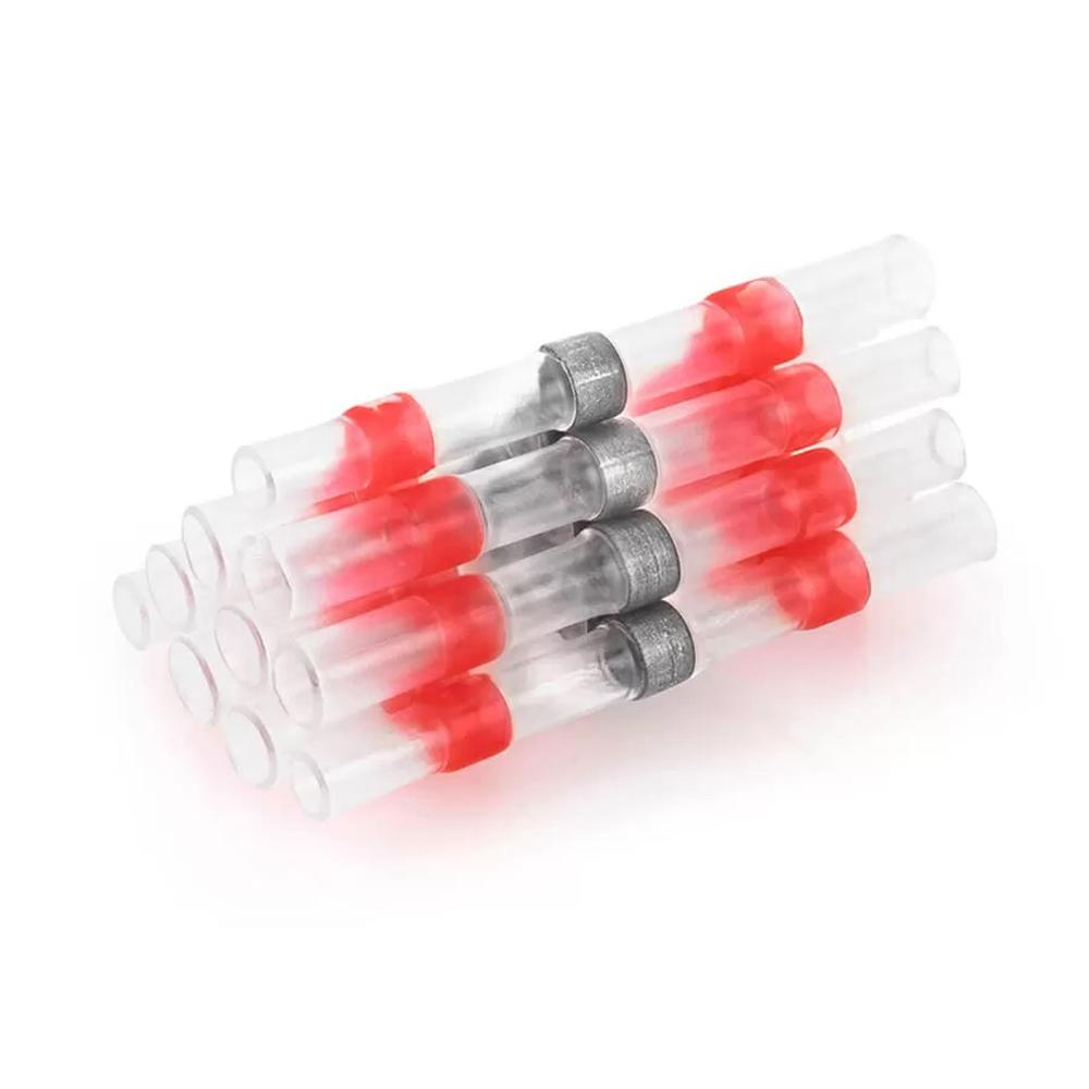 Термоусадочные коннекторы STEKKER LD302-05-15, длина 26мм. 100шт. в наборе, цвет: прозрачный, красный. Коэффициент усадки 2:1, диапазон рабочих температур -10..+35°C, температура усадки +85..+125°C, номинальный ток 19А, для проводов сечением мм2.