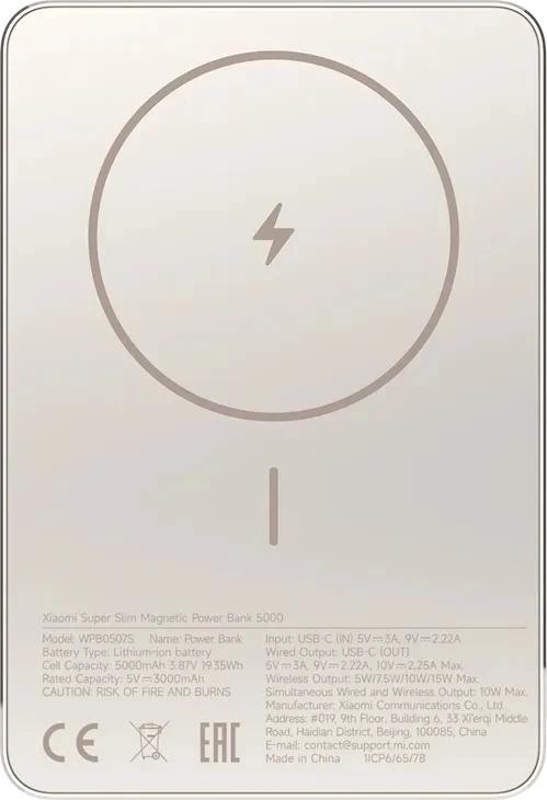 Мобильный аккумулятор Xiaomi Super Slim Magnetic 5000mAh QC3.0 / PD3.0 22.5W 3A USB-C беспров.зар. золотистый (BHR08PLGL)