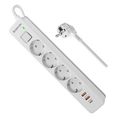 Сетевой фильтр Defender DFS 141, 1.5 м, 4 розетки, 3680 Вт, QC / PD, 2xUSB A+C, белый (99433)