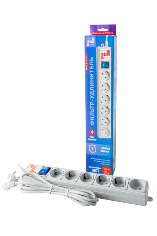 Фильтр-удлинитель Power Cube сетевой фильтр, 1,9 метра, 6 розеток (5 с заземлением + 1 без заземления), 16А / 3,5кВт, cечение провода: 3х1,0мм2, цвет белый, 4 года гарантии, Россия, МПТ