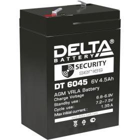 Батарея DELTA серия DT, DT 6045, напряжение 6В, емкость 4.5Ач (разряд 20 часов), макс. ток разряда (5 сек.) 70А, макс. ток заряда 1.35А, свинцово-кислотная типа AGM, клеммы F1, ДxШxВ 70х47х100мм., вес 0.75кг., срок службы 5 лет. / Battery DELTA series DT,
