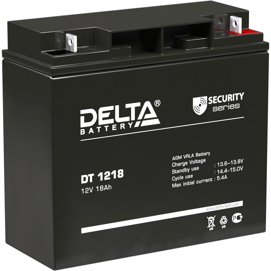 Батарея DELTA серия DT, DT 1218, напряжение 12В, емкость 18Ач (разряд 20 часов), макс. ток разряда (5 сек.) 250А, макс. ток заряда 5.4А, свинцово-кислотная типа AGM, клеммы под гайку и болт M6, ДxШxВ 181х77х160мм., вес 5.2кг., срок службы 5 лет. / Battery