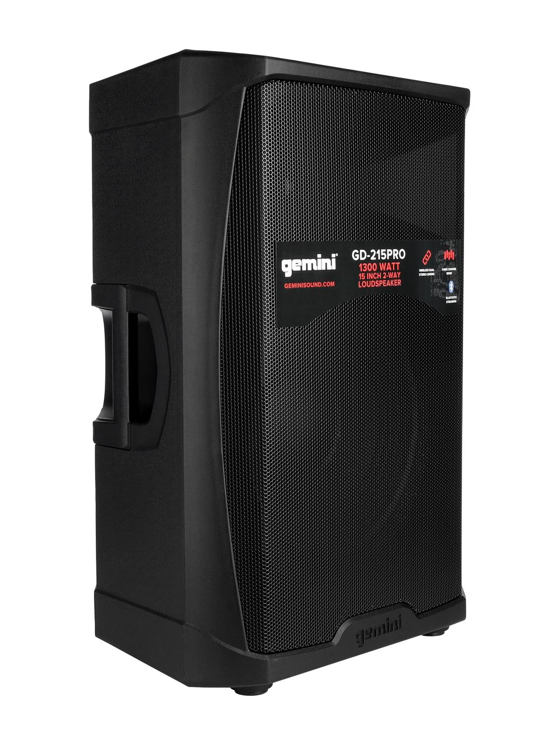Акустическая система [GD-215PRO E] Gemini [GD-215PRO] Активная, 2-х полосная, мощность RMS / Peak 280 / 1300 Вт, Max Peak SPL 120 Вт, динамики: 15" НЧ, 1,35" ВЧ, входы: 1 / 8 TRS AUX, 2x 1 / 4" TRS, 2x XLR, 2x RCA AUX, выходы: XLR Mix Out, Bluetooth, микрофон