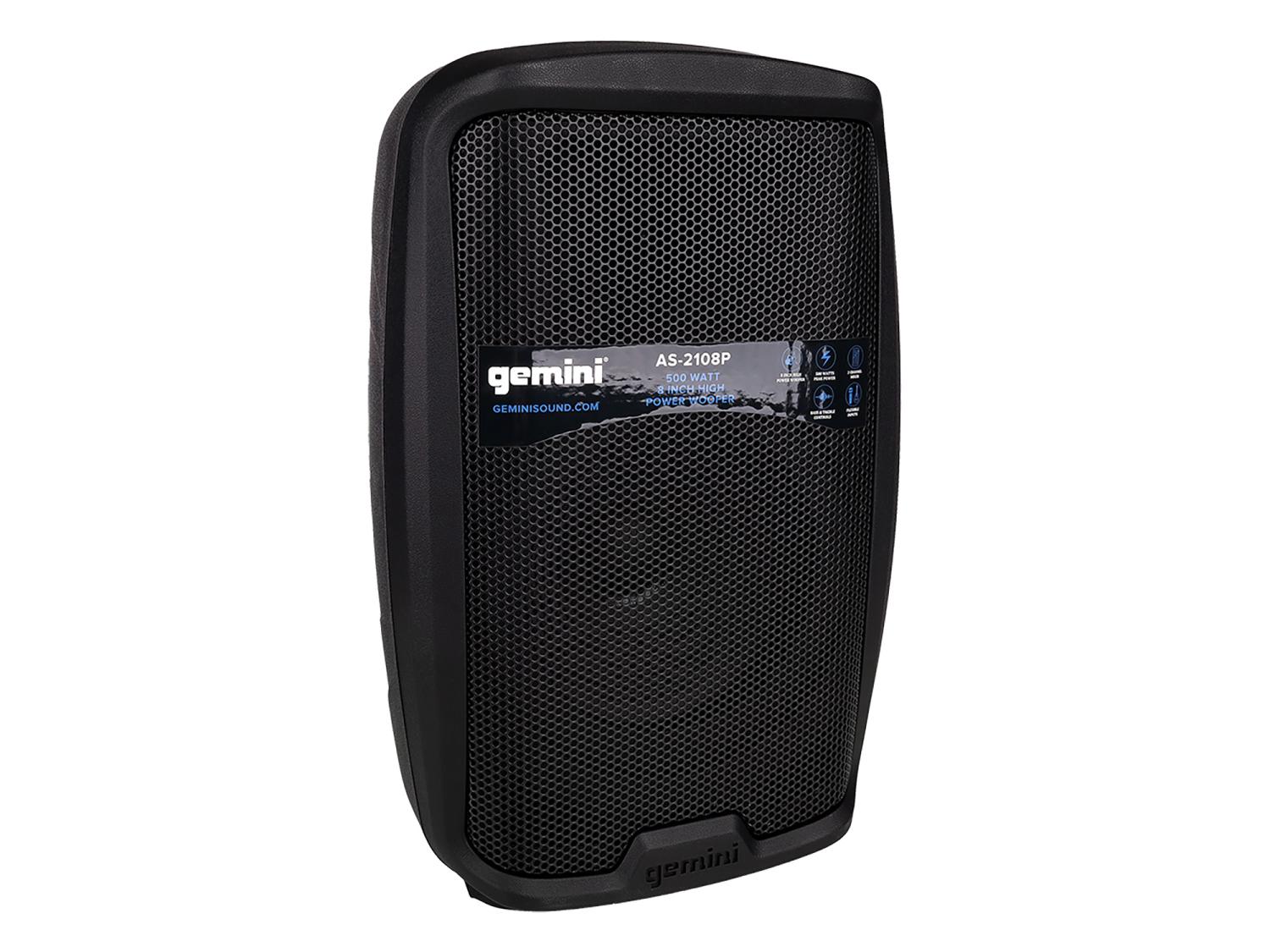 Акустическая система [AS-2108P] Gemini [AS-2108P] Активная, 2-х полосная, мощность RMS / Peak 250 / 500 Вт, АЧХ 60-20000 Гц, Max SPL 98 дБ, динамики: 8" НЧ, 1" ВЧ, входы: 1 / 8" TRS AUX, RCA (L / R) AUX, 2xXLR микрофонные, 2x1 / 4" линейные, выходы: XLR Mix