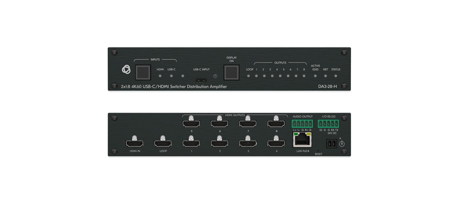 Усилитель-распределитель Kramer Electronics [DA3-28-H] 1:8 HDMI с коммутатором 2х1 HDMI + USB-C и деэмбедером аудио; поддержка 4K60 4:4:4, HDMI 2.0, PoE