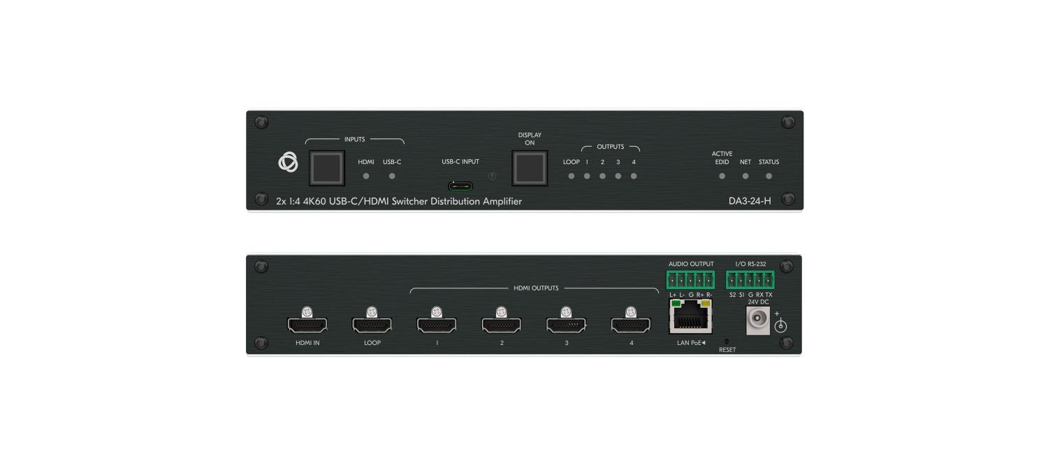 Усилитель-распределитель Kramer Electronics [DA3-24-H] 1:4 HDMI с коммутатором 2х1 HDMI + USB-C и деэмбедером аудио; поддержка 4K60 4:4:4, HDMI 2.0, PoE
