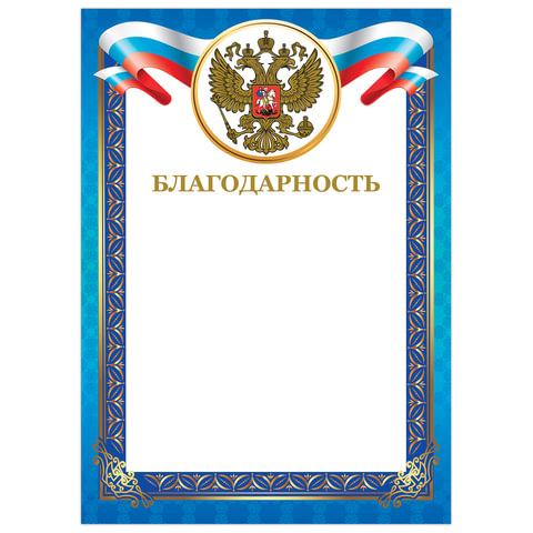 Грамота "Благодарность", А4, мелованный картон, конгрев, тиснение фольгой, синяя рамка, BRAUBERG, 128345