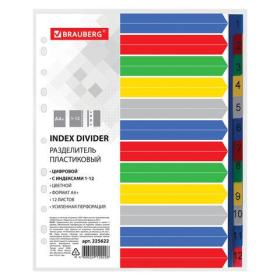 Разделитель пластиковый широкий BRAUBERG А4+, 12 листов, цифровой 1-12, оглавление, цветной, 225622