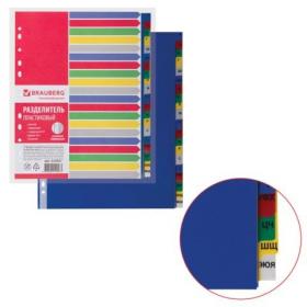 Разделитель пластиковый широкий BRAUBERG А4+, 20 листов, алфавитный А-Я, оглавление, цветной, 225627