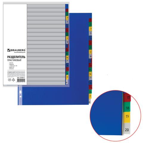 Разделитель пластиковый BRAUBERG, А4, 20 листов, цифровой 1-20, оглавление, цветной, РОССИЯ, 225611