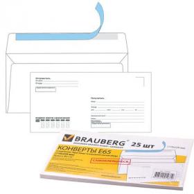 Конверты Е65 (110х220 мм), отрывная лента, 80 г / м2, КОМПЛЕКТ 25 шт., внутренняя запечатка, BRAUBERG, 122449