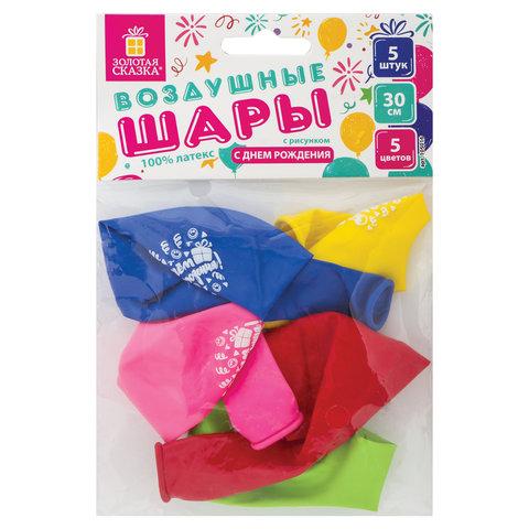 Шары воздушные ЗОЛОТАЯ СКАЗКА, 12" (30 см), КОМПЛЕКТ 5 штук, ассорти 5 цветов, с рисунком "С Днем Рождения", пакет, 105016