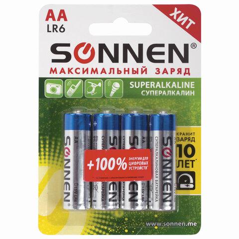 Батарейки КОМПЛЕКТ 4 шт., SONNEN Super Alkaline, АА (LR6,15А), алкалиновые, пальчиковые, блистер, 451094