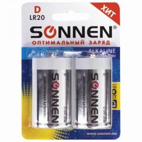 Батарейки КОМПЛЕКТ 2 шт, SONNEN Alkaline, D (LR20, 13А), алкалиновые, в блистере, 451091