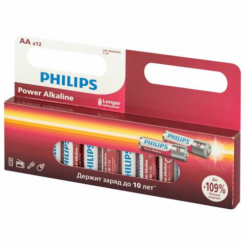 Батарейки алкалиновые "пальчиковые" КОМПЛЕКТ 12 шт., PHILIPS Power Alkaline, АА (LR6, 24А), блистер, Б0064661