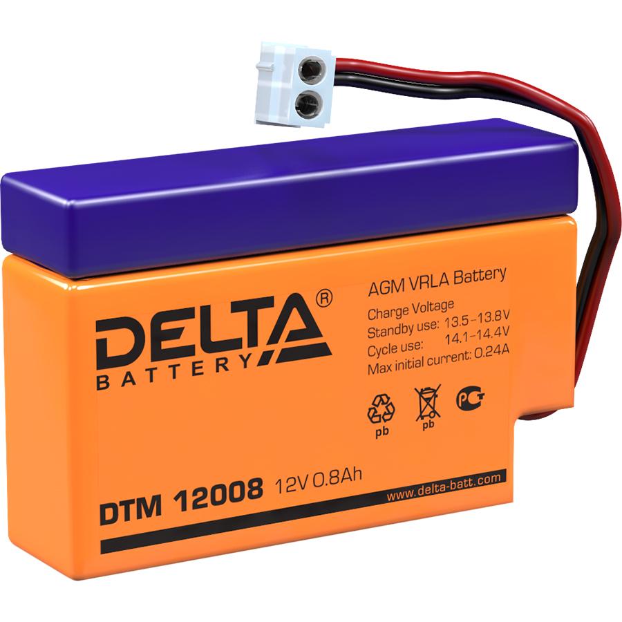 Батарея DELTA серия DTM, DTM 12008, напряжение 12В, емкость 0.8Ач (разряд 20 часов), макс. ток разряда (5 сек.) 12А, макс. ток заряда 0.24А, свинцово-кислотная типа AGM, провод с гнездом AMP Т9, ДxШxВ 96х25х62мм., вес 0.4кг., срок службы 6 лет. / Battery