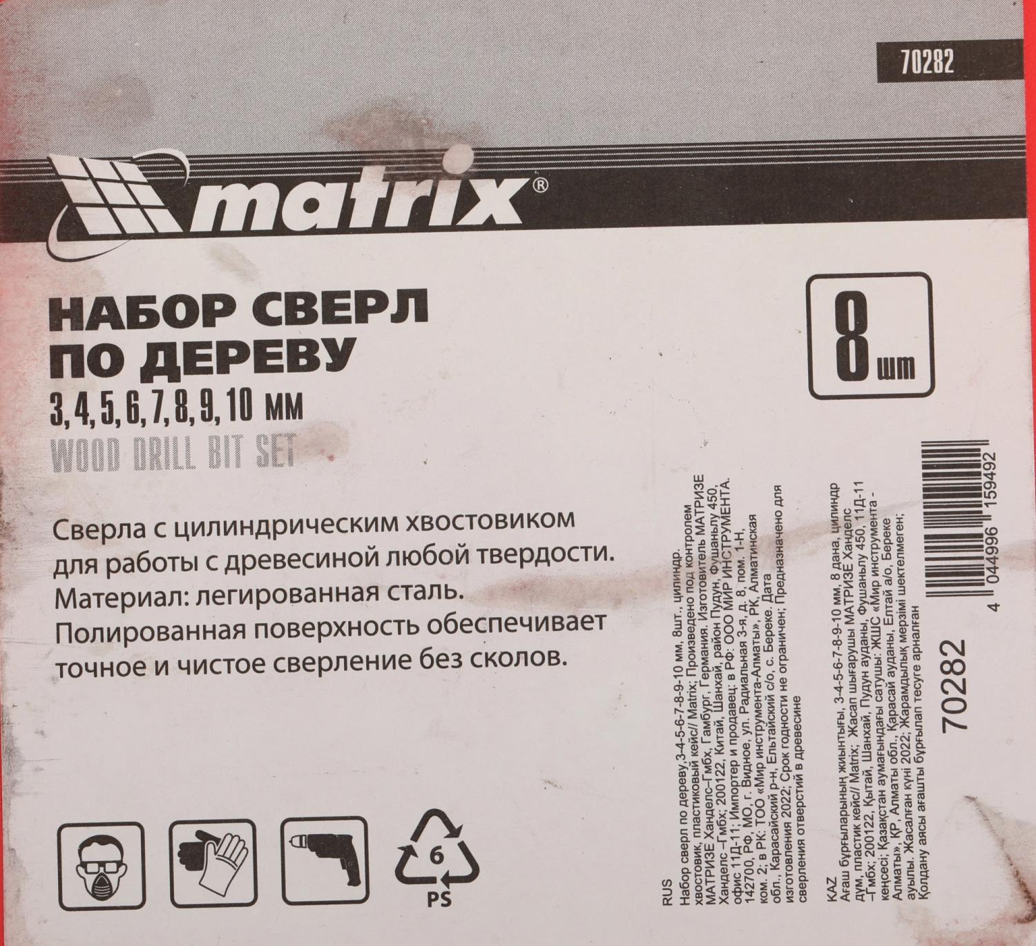 Набор сверл Matrix 70282 по дереву (8пред.) для дрелей