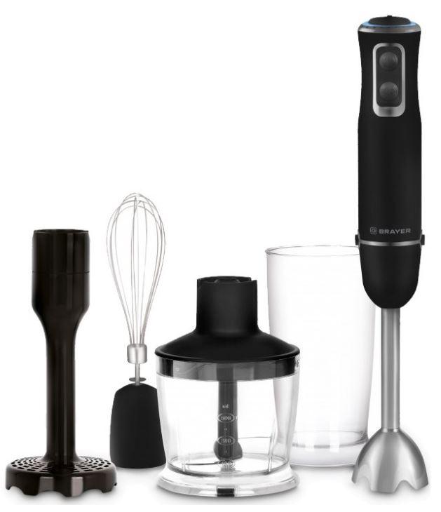 Блендер погружной BRAYER BR1244, 800 Вт, 8 скоростей, 4 насадки, стакан, черный