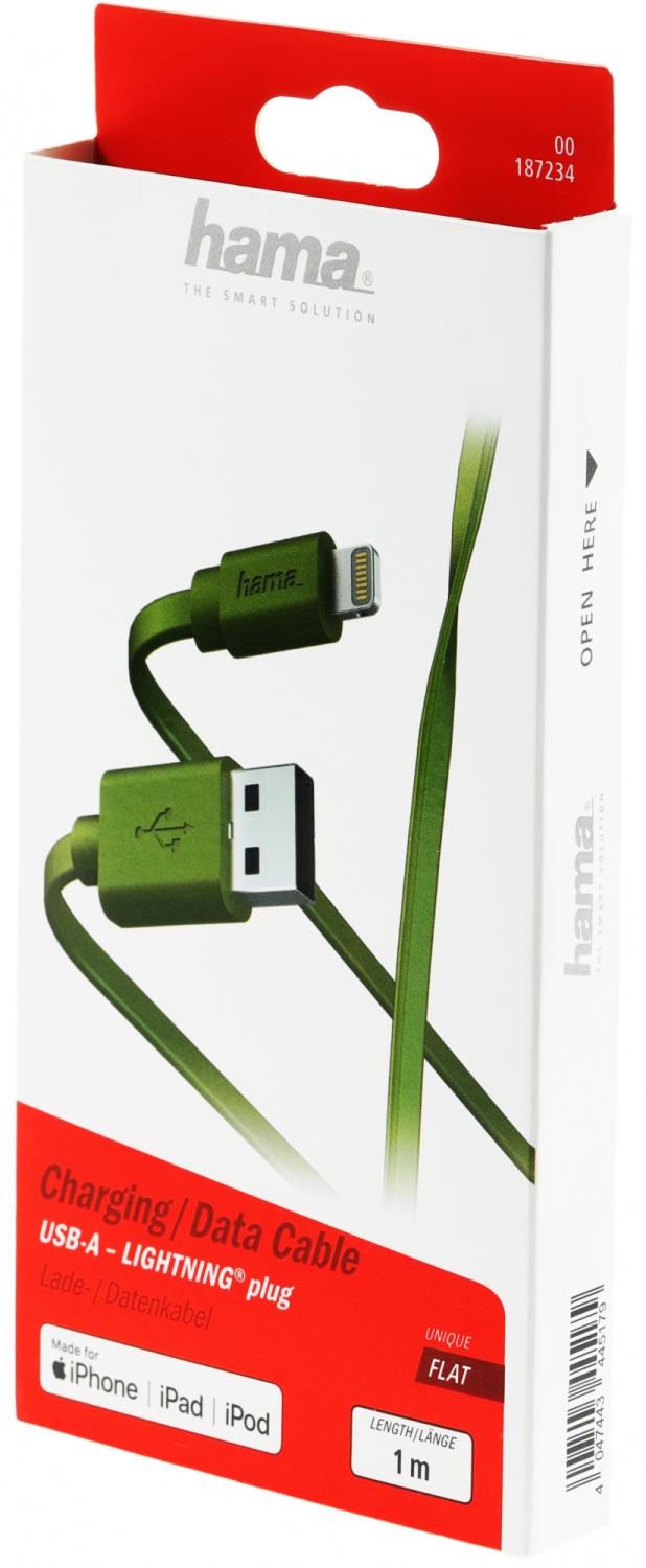 Кабель Hama 00187234 USB (m)-Lightning (m) 1м зеленый плоский