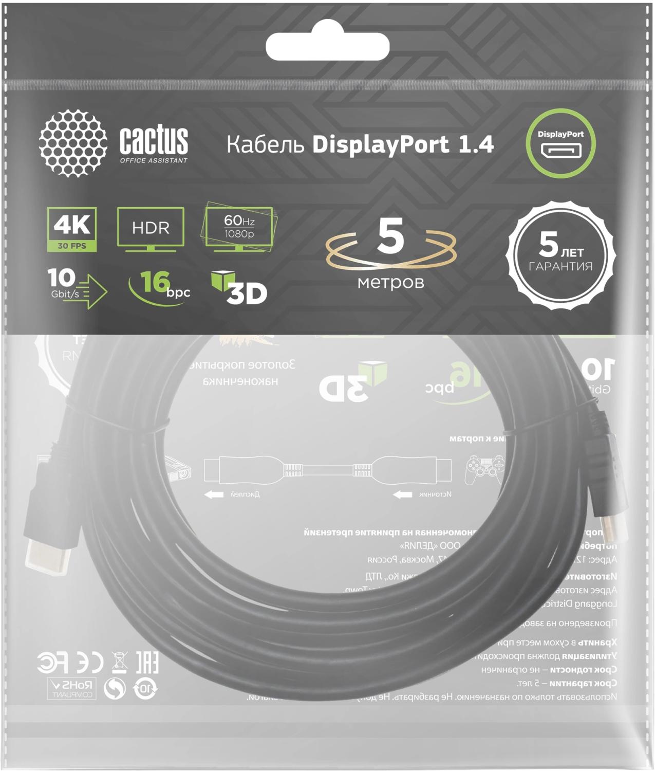 Кабель аудио-видео Cactus CS-DP-DP-1.4-5 DisplayPort (m) / DisplayPort (m) 5м. позолоч.конт. черный