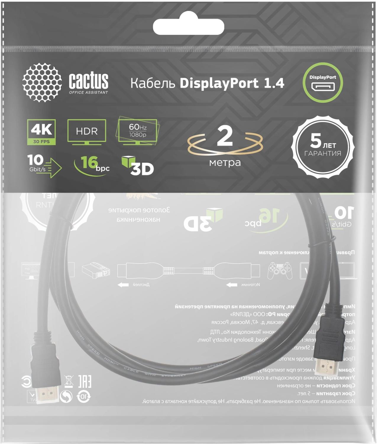Кабель аудио-видео Cactus CS-DP-DP-1.4-2 DisplayPort (m) / DisplayPort (m) 2м. позолоч.конт. черный