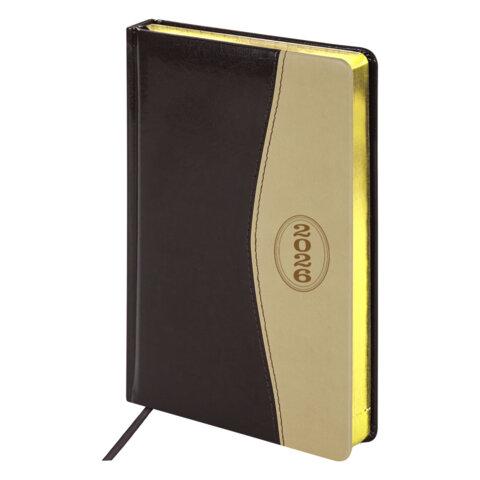 Ежедневник датированный 2026, А5, 138x213 мм, BRAUBERG "De Luxe", под кожу, коричневый / бежевый, 117053