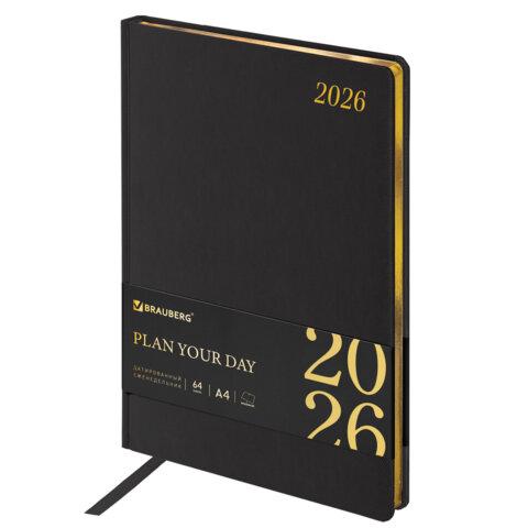 Еженедельник датированный 2026, БОЛЬШОЙ ФОРМАТ 210х297 мм, А4, BRAUBERG "Iguana", под кожу, черный, 117153