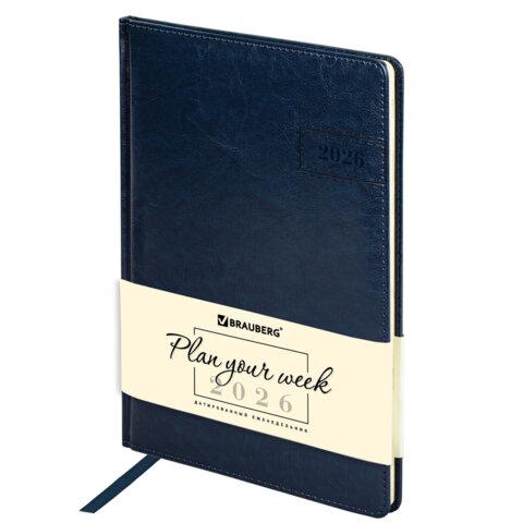 Еженедельник датированный 2026, А5, 145х215 мм, BRAUBERG "Select", балакрон, темно-синий, 117181