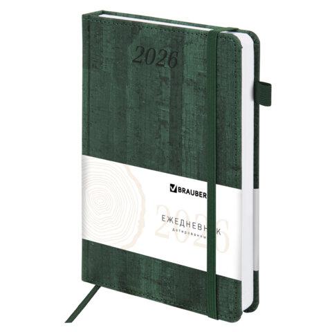 Ежедневник датированный 2026 А5 138x213 мм, BRAUBERG "Wood", под кожу, держатель для ручки, зеленый, 117109