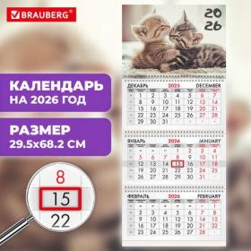 Календарь квартальный на 2026 г., 3 блока, 3 гребня, бегунок, офсет, BRAUBERG, "Милые котята", 116770