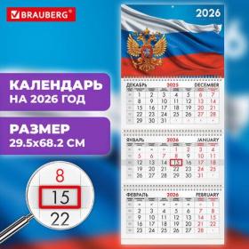 Календарь квартальный на 2026 г., 3 блока, 3 гребня, бегунок, офсет, BRAUBERG, "Россия", 116765