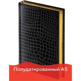 Ежедневник полудатированный А5 (138х213 мм) BRAUBERG "Alligator", под кожу, 192 л., черный, 124985