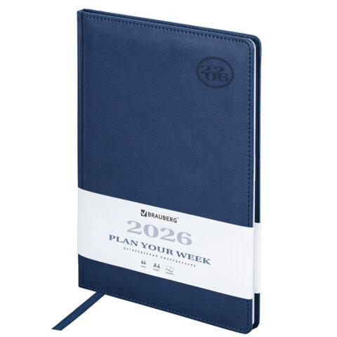 Еженедельник датированный 2026 БОЛЬШОЙ ФОРМАТ 210х297 мм, А4 BRAUBERG "Favorite", под кожу, синий, 117151