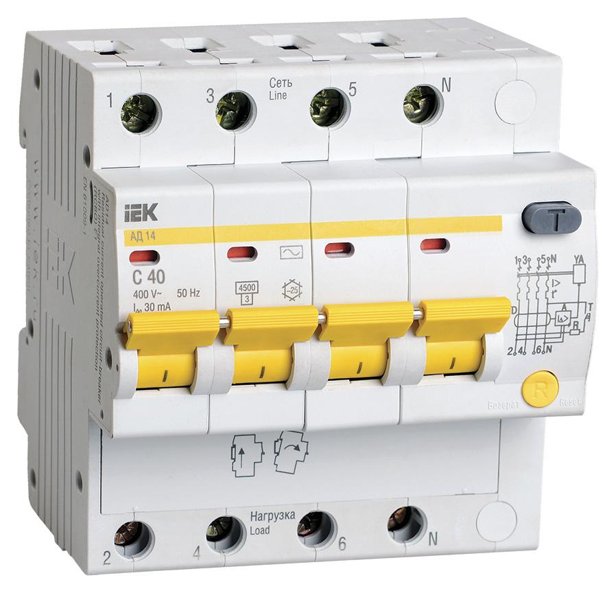 Автоматический выключатель дифф. тока IEK АД14 (MAD10-4-040-C-030) 40A тип C 4.5кА 4П 400В 5 модулей белый (упак.:1шт)