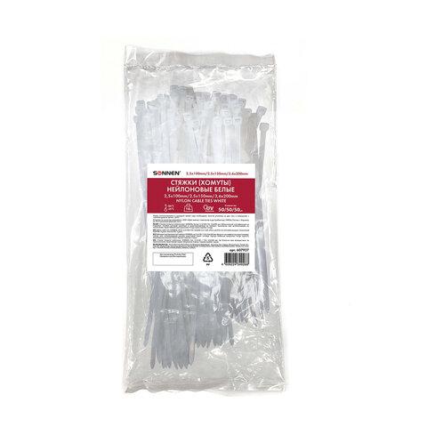 Стяжки (хомуты) нейлоновые сверхпрочные НАБОР 150 шт. (2,5х100 / 150 мм; 3,6х200 мм), белые, SONNEN, 607927