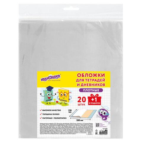 Обложки ПЭ для тетрадей и дневников, НАБОР 20 шт. +1 шт., ПЛОТНЫЕ, 110 мкм, 210х350 мм, прозрачные, ЮНЛАНДИЯ, 274106