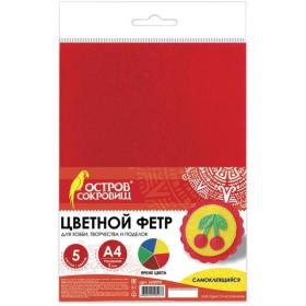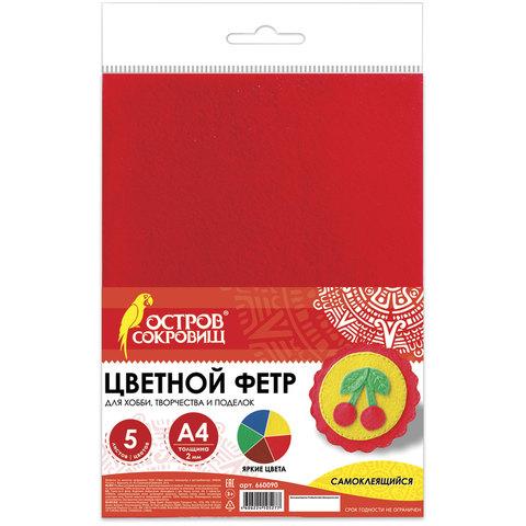 Цветной фетр МЯГКИЙ А4, 2 мм, 5 листов, 5 цветов, плотность 170 г / м2, самоклеящийся, ОСТРОВ СОКРОВИЩ, 660090