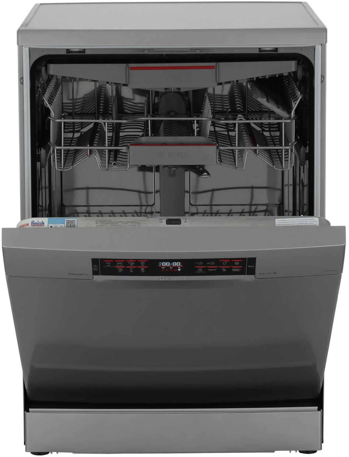 Отдельностоящая посудомоечная машина Bosch, 60 см, 13 комплектов, 8 программ, активная сушка с теплообменником, сенсорное управление, дисплей, отсрочка старта, половинная загрузка, уровень шума 40 дБ, энергоэффективность А++, цвет серебряный