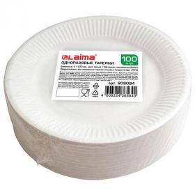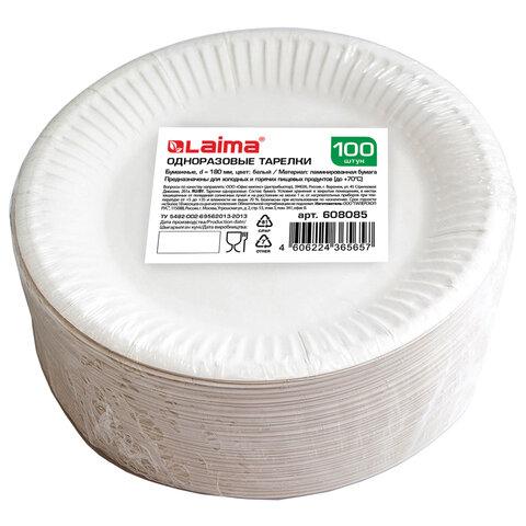 Тарелка одноразовая бумажная 180 мм, КОМПЛЕКТ 100 шт., БЮДЖЕТ, белая мелованная, LAIMA, 608083