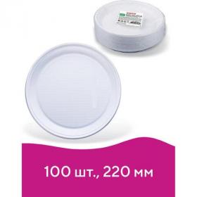Одноразовые тарелки плоские, КОМПЛЕКТ 100 шт., пластик, d=220 мм, СТАНДАРТ, белые, ПП, холодное / горячее, LAIMA, 602649