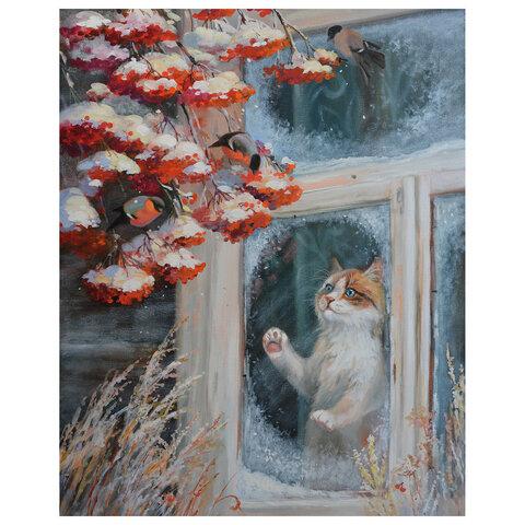 Картина по номерам 40х50 см, ОСТРОВ СОКРОВИЩ "Кот и снегири", на подрамнике, акрил, кисти, 662899
