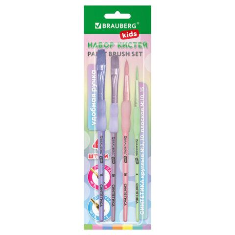 Кисти c силиконовой вставкой НАБОР 4 шт. (синтетика круглые №3, 10; плоские №10, 15), блистер, BRAUBERG KIDS, 201097