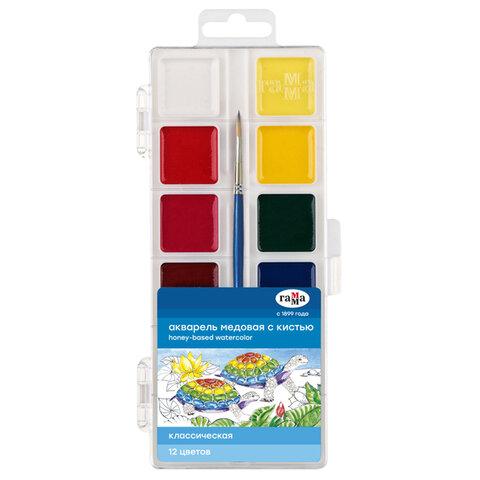 Краски акварельные ГАММА "Классическая", 12 цветов, медовая, c кистью, пластиковая коробка, европодвес, 1009201