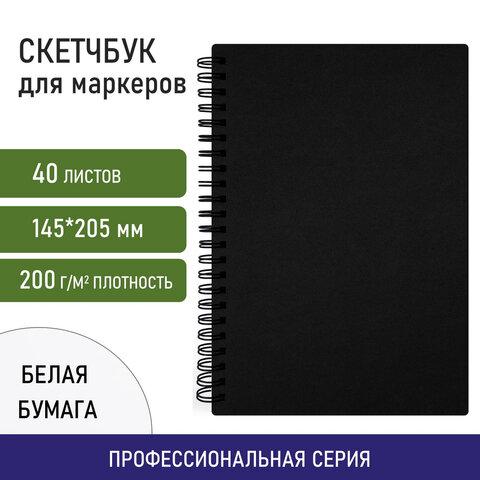 Скетчбук для маркеров, бумага ВХИ 200 г / м2 145х205 мм, 40 л., гребень, твердая обложка, ЧЕРНАЯ, BRAUBERG ART CLASSIC, 115079