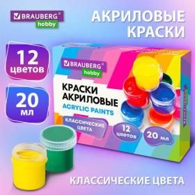 Краски акриловые для рисования и творчества 12 цветов по 20 мл, BRAUBERG HOBBY, 192435