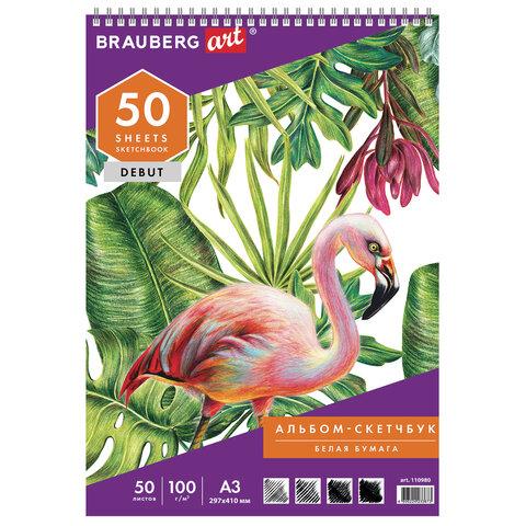 Скетчбук, белая бумага 100 г / м2, 297х410 мм, 50 л., гребень, жёсткая подложка, BRAUBERG ART DEBUT, 110980