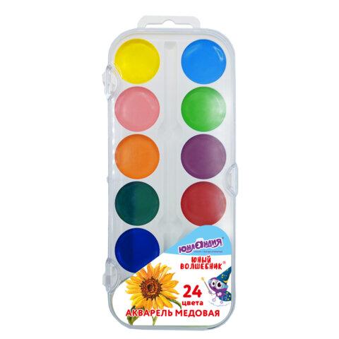 Краски акварельные ЮНЛАНДИЯ "ЮНЫЙ ВОЛШЕБНИК", медовые, 24 цвета, круглые кюветы, пластик, 192359