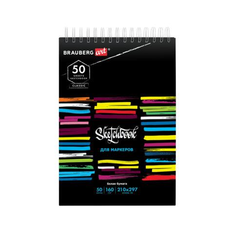 Скетчбук для маркеров, бумага 160 г / м2, 210х297 мм, 50 л., гребень, подложка, BRAUBERG ART CLASSIC, "Неон", 115077