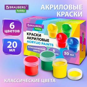 Краски акриловые для рисования и творчества 6 цветов по 20 мл, BRAUBERG HOBBY, 192434
