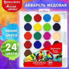 Краски акварельные BRAUBERG "МАГИЯ ЦВЕТА NEW", медовые, 24 цвета, круглые кюветы, пластиковый пенал, 192365